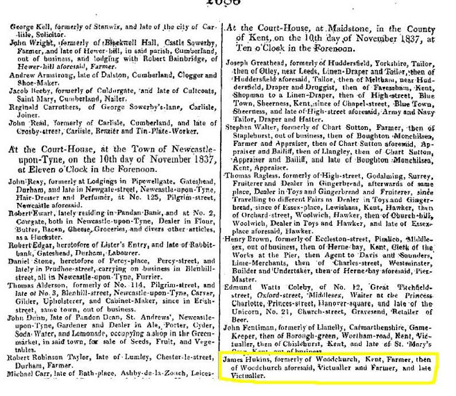 James was petitioning the Court for Relief of Insolvent Debtors. Interestingly, the article lists James as "formerly of Woodchurch", so it seems he had left the village, had given up running the inn, and appeared to be living in Maidstone, Kent at this time.